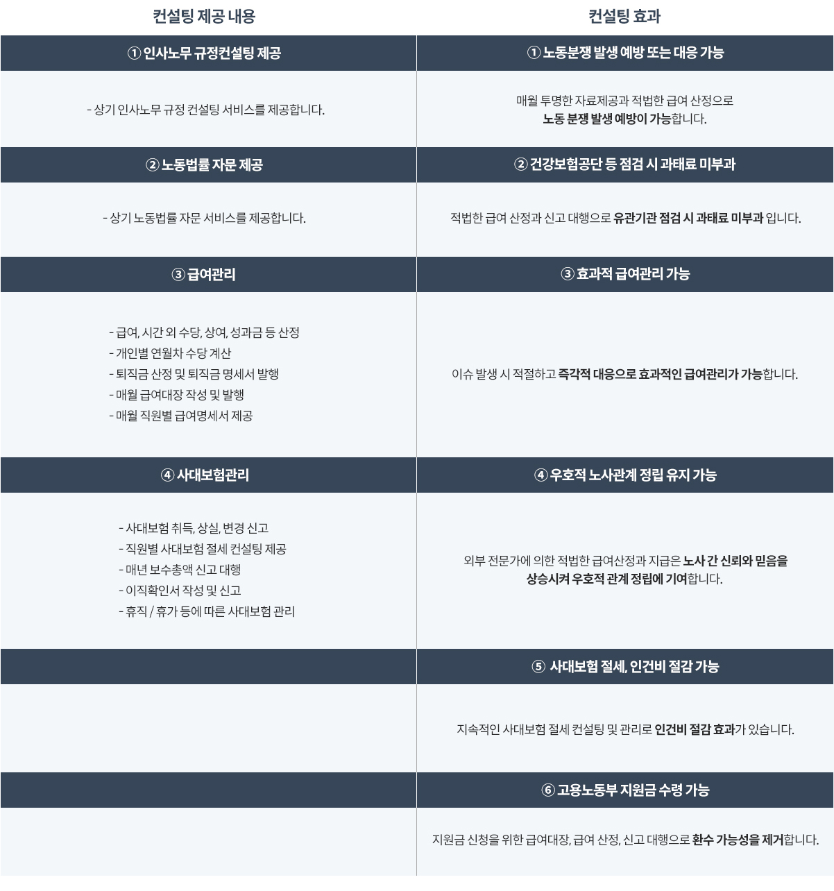 - ※ 특히 급여 - 사대보험 관리는 직접적인 이해관계로 인해 까다롭고 분쟁의 소지가 많습니다. 외부의 인사노무 전문가가 매월 적법한 급여관리를 제공함으로써 노사 간 믿음과 신뢰를 구축할 수 있습니다.
